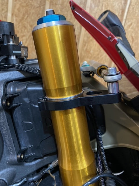 NOTE: This kit will mount your OEM steering damper- just as your stock clipons will. The OEM master cylinder mount will need to be slightly bent in order to achieve lock to lock fairing clearance. This will mount below the taper onto the 51.5mm portion of the fork tube.